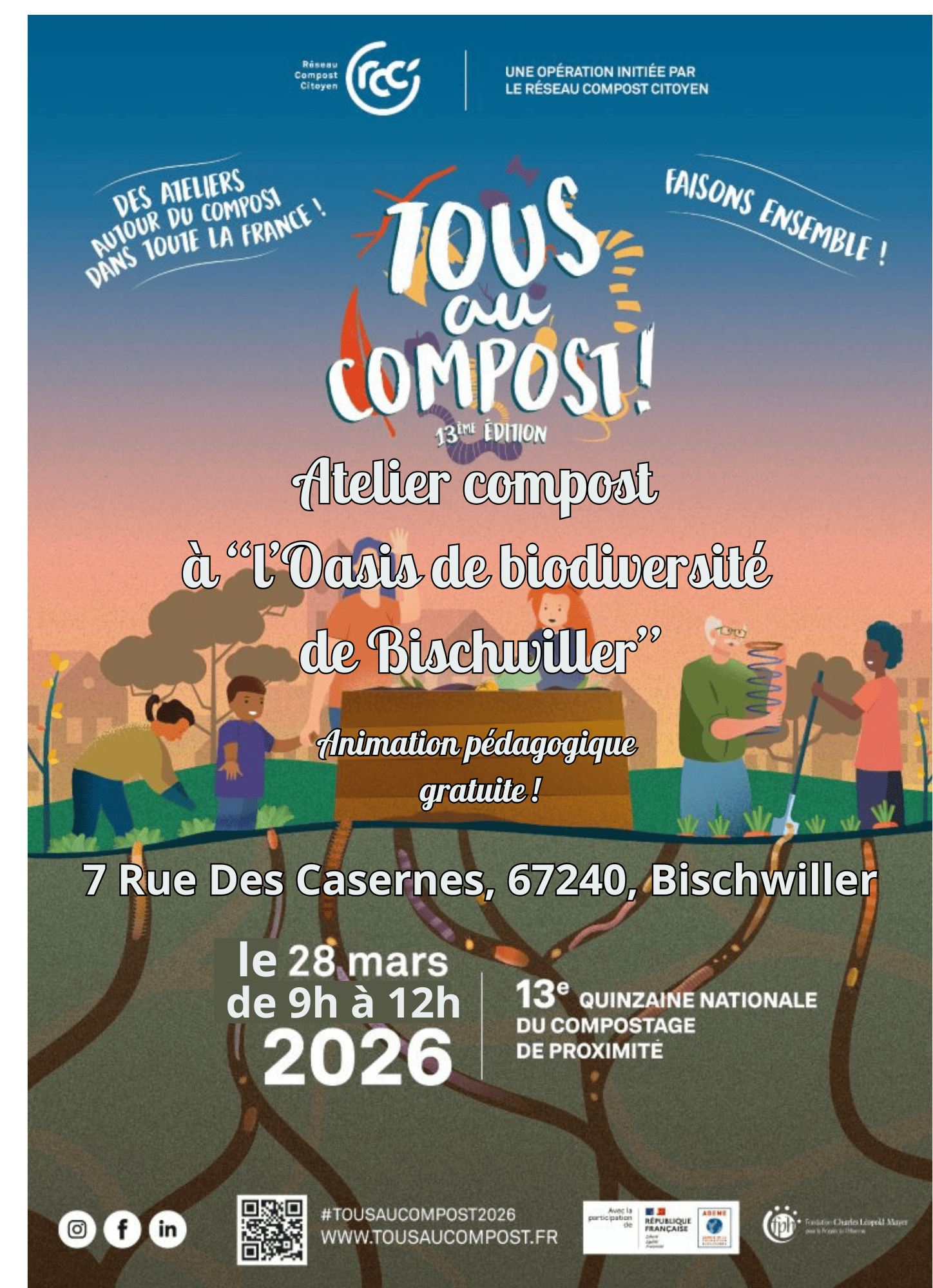 Dans le cadre de la 13ᵉ Quinzaine nationale du compostage de proximité, un atelier compost est proposé le 28 mars de 9h à 12h, à l’Oasis de biodiversité de Bischwiller (7 rue des Casernes).